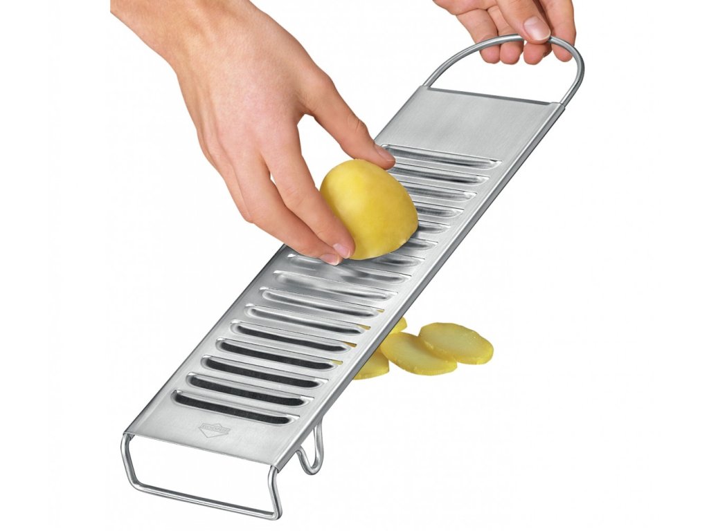 Struhadlo z nerezu o rozměrech 43,5 x 11,5 x 3,5 cm řeže pěkné, rovnoměrné plátky brambor a zeleniny, které využijete při přípravě bramborového salátu, smažených bramborových dukátků a také pokud budete chtít brambory nebo zeleninu gratinovat.
