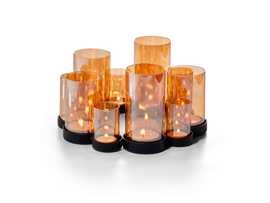 BELLO HORIZONTE Designový svícen to je světelná symfonie pro váš domov. Jsou to stovky světel, které vycházejí z 10 zrcadlových, jantarově zbarvených skleněných trubic. Stojící na ocelovým držáku s práškovým nástřikem, který dodává lehkému skleněnému věnci robustnost pro nezapomenutelnou atmosféru a to nejen vánoční.