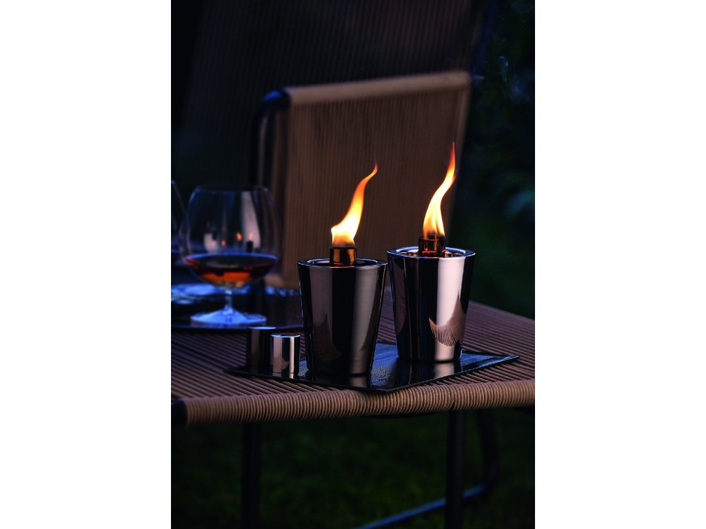 TARCIA Nádherná olejová lampa z černého leštěného nerezu je ideální pro romantické večery i oslavy a párty.