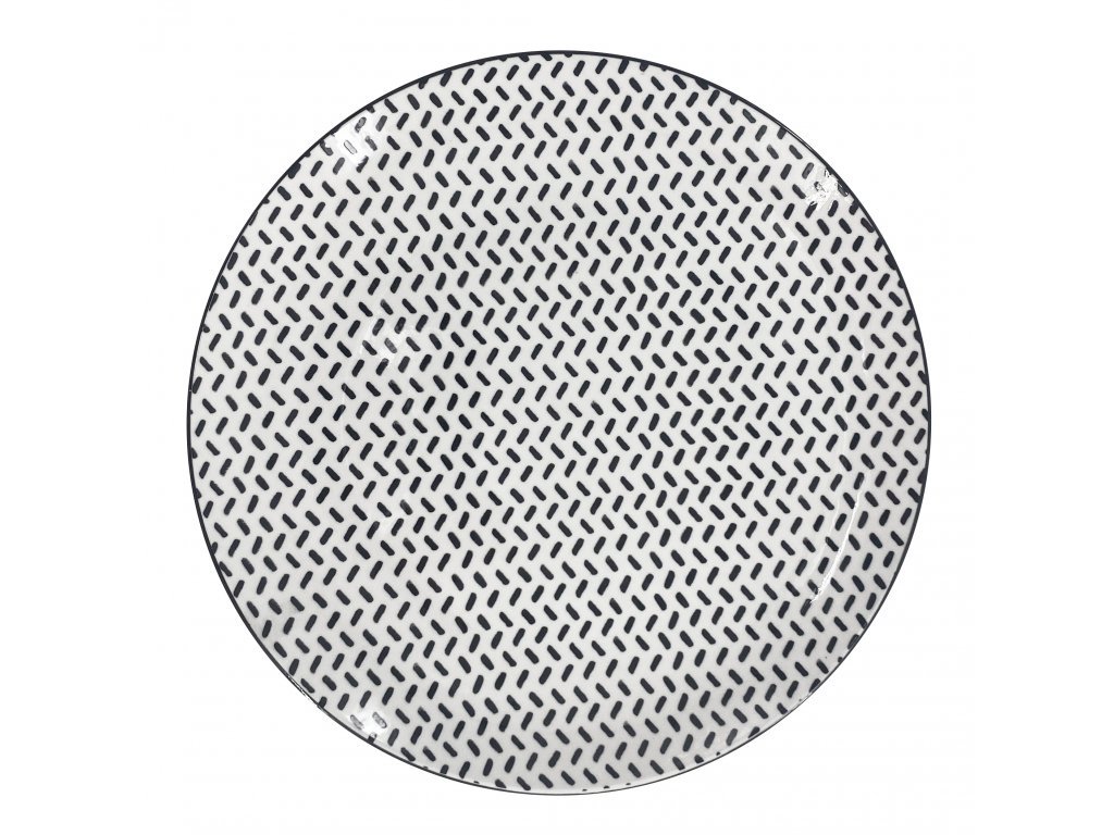 Porcelánový talíř na hlavní chody, ale využijete ho i jako servírovací tác na servírování zákusků, chlebíčků i jednohubek. Je vyroben z bílého porcelánu s černým dekorem a patří do kolekce porcelánu BLACKLINE. Talíř má průměr 26,5 cm, je vysoký 2,6 cm. Talířek je bílý s čárkami ve tvaru stromku.