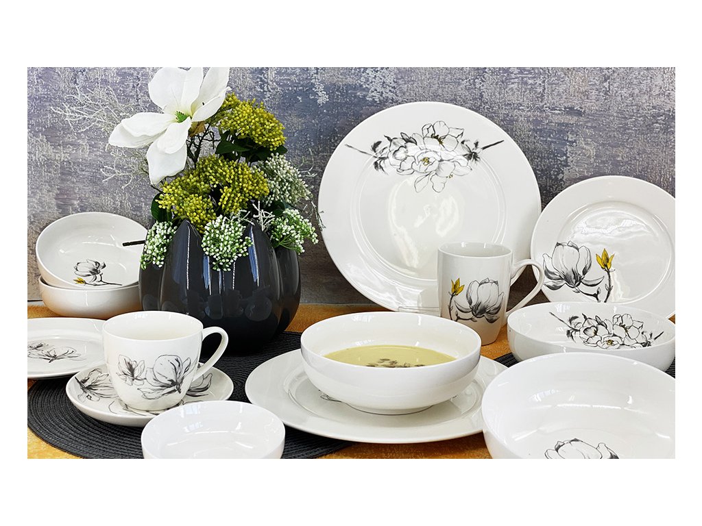 FINE TWIG Bílý porcelánový jídelní mělký talíř na hlavní chody, který využijete i jako servírovací tác na zákusky, chlebíčky i jednohubky z kolekce porcelánu FINE TWIG. Vyznačuje se krémovou barvou, elegantním a klasickým vzhledem. Podkladem pro toto porcelánové nádobí je kolekce porcelánu FINE, která je dozdobena motivem magnólií v černé a žluté barvě. Tuto kolekci porcelánu FINE TWIG tvoří kulaté mělké jídelní a dezertní talíře, polévková miska, také misky ve dvou velikostech a šálek s podšálkem. Vše můžete zakoupit i samostatně. Talířek má průměr 27 cm a výšku 1,5 cm. Toto nádherné nádobí využijete při každodenním stolování i při svátečních příležitostech. Talíře můžete zakoupit i jako sadu nádobí 18 ks.