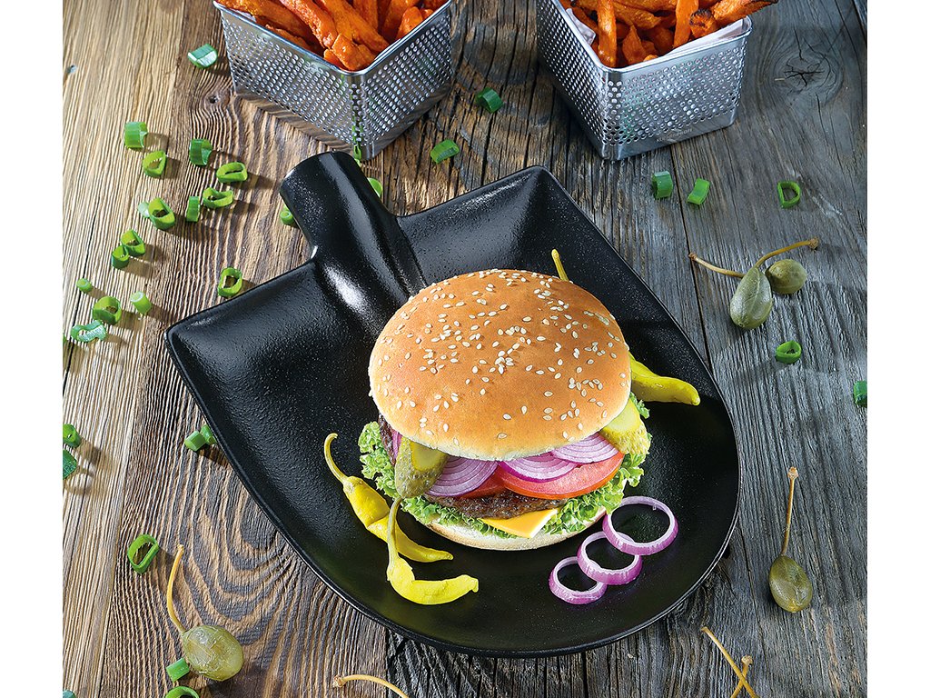 Vaši hosté budou ohromeni z netradičního talíře ve tvaru lopaty. Je vyroben z glazované keramiky černé barvy vyrobené v Portugalsku. Keramický talíř WORKER má rozměry 25x18x5 cm.