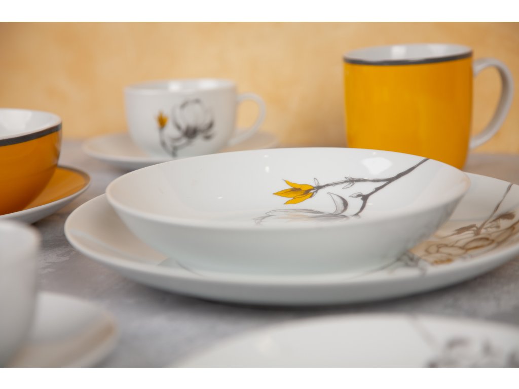 Porcelánový polévkový talíř o průměru 20 cm v bílé barvě s nádhernými květy magnolie v šedo-žluté barvě zkolekce porcelánu TWIG.