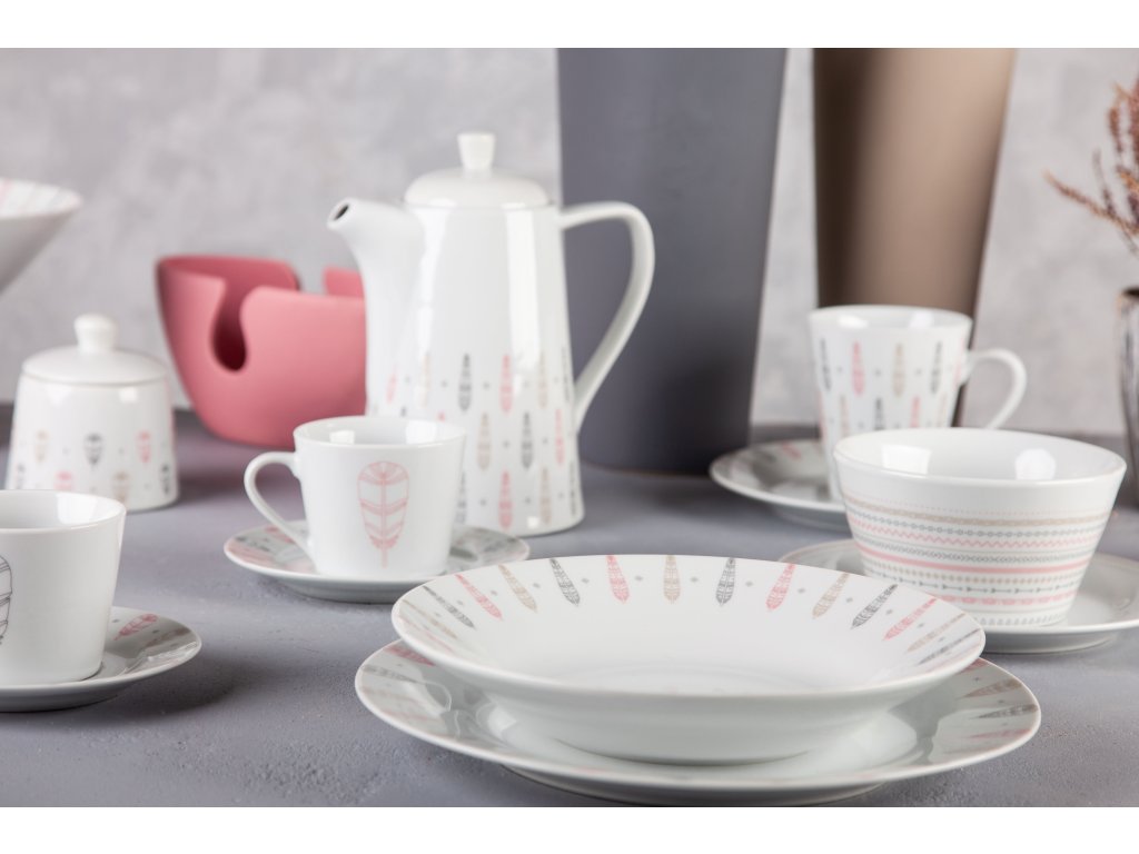 Kolekce porcelánu PÍRKA přináší veselý a moderní motiv pírek v šedé, růžové a smetanové barvě. Můžete vybírat talíře, šálky s podšálky, hrnky, cukřenky, mléčenky i konvice na kávu ve dvou dekorech. Samostatná pírka nebo pírka s totemem.