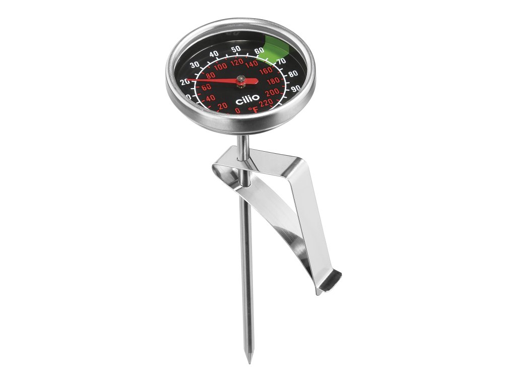 Teploměr na mléko od německé značky Cilio vám usnadní měření požadované teploty mléka a jiných nápojů. Je to ideální nástroj pro každého, kdo si chce vychutnat cappuccino, latte macchiato a další kávové speciality do dokonalosti. Díky nastavitelnému klipu zůstává teploměr na mléko bezpečně připevněn k hrnci nebo pánvi. Stupnice má rozsah až 100 °C / 220 °F, takže snadno odečtete požadovanou teplotu. Barevné značení v rozmezí 60 °C - 70 °C vám ukazuje optimální teplotní rozsah pro lahodnou mléčnou pěnu.