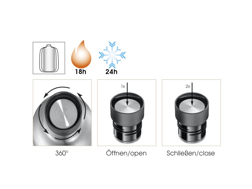 Je vyrobena z robustní, nerezové oceli a má dvojitou stěnu s měděným povlakem. Nerozbitná a nepropustná termoláhev udrží nápoje teplé 18 hodin nebo studené 24 hodin během outdoorových aktivit, v práci, na cestách nebo při cvičení. Dobrá zpráva pro fanoušky střiků a podobných nápojů: Tato chytrá láhev je vhodná i pro sycené nápoje. Praktický 360° uzávěr lze pro důkladné vyčištění rozebrat.