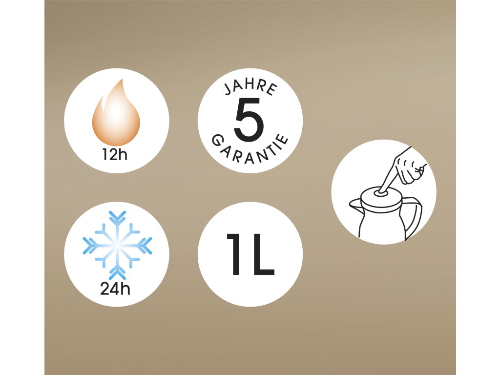 Je vyrobena z vysoce kvalitního plastu a má robustní vložku z vakuově tvrzeného skla. Kávu nebo čaj udrží horké po dobu 12 hodin a vodu, džusy nebo smoothies studené až 24 hodin. Šroubovací víko sedí pevně a bezpečně a tlačítko nalévání vám umožní přesně a bez rozlití nalít nápoje. Termo džbán MONZA s nadčasovým designem vypadá skvěle na každém stole.