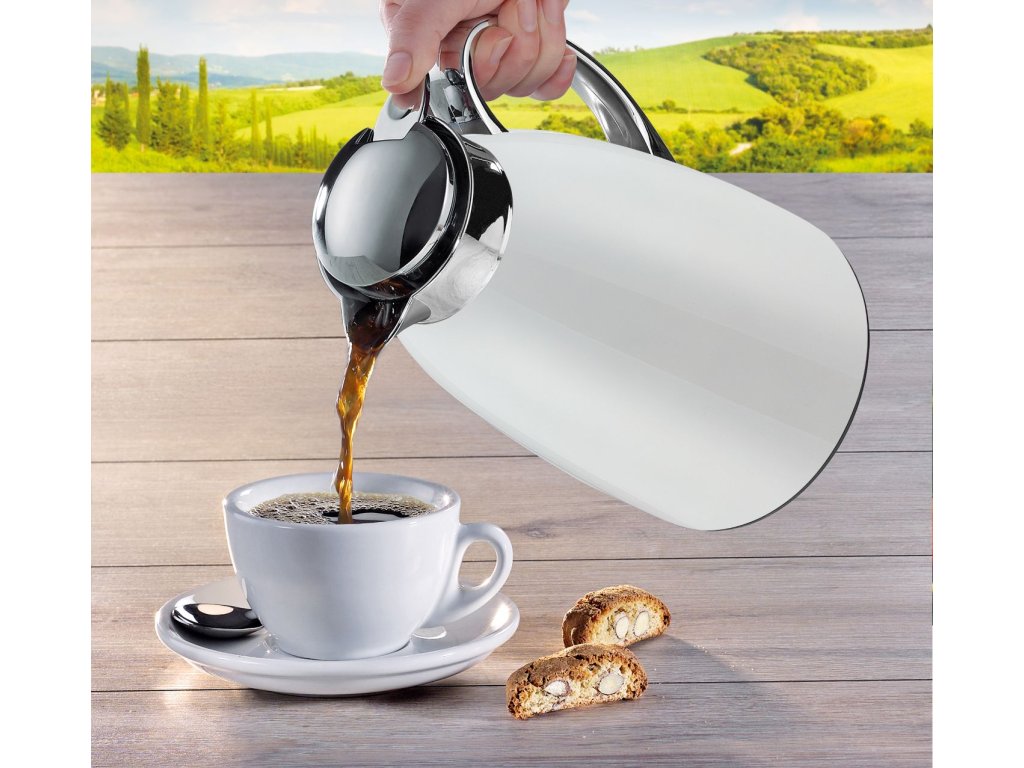 Díky termo konvici VENEZIA o objemu 1 l si můžete vychutnat svůj oblíbený nápoj při správné teplotě. Udrží kávu nebo čaj horký až 12 hodin, domácí limonáda na pikniky zůstane chladná až 24 hodin. Džbán se šroubovacím uzávěrem je vyrobený z matné nerezové oceli, uvnitř je tepelně odolná vložka z tvrzeného skla. Je vhodná i na cesty. Pokud se položí na bok, víko pevně drží a tekutina neunikne (zkoušeli jsme to).