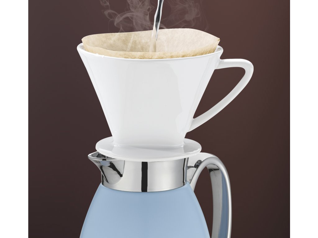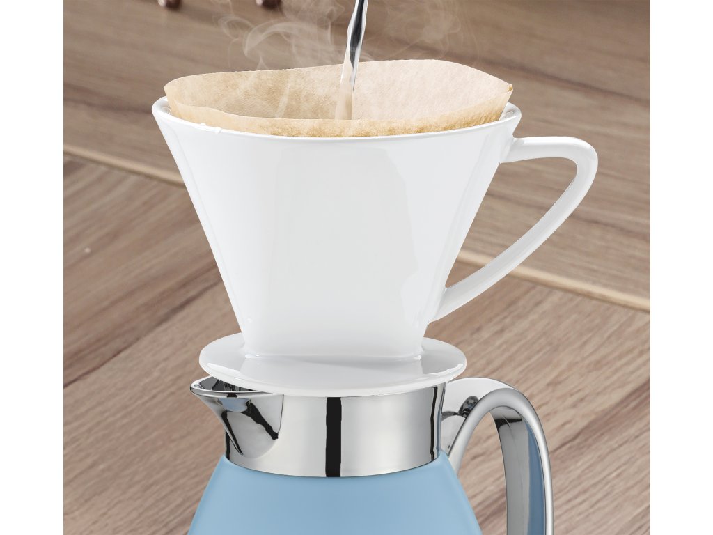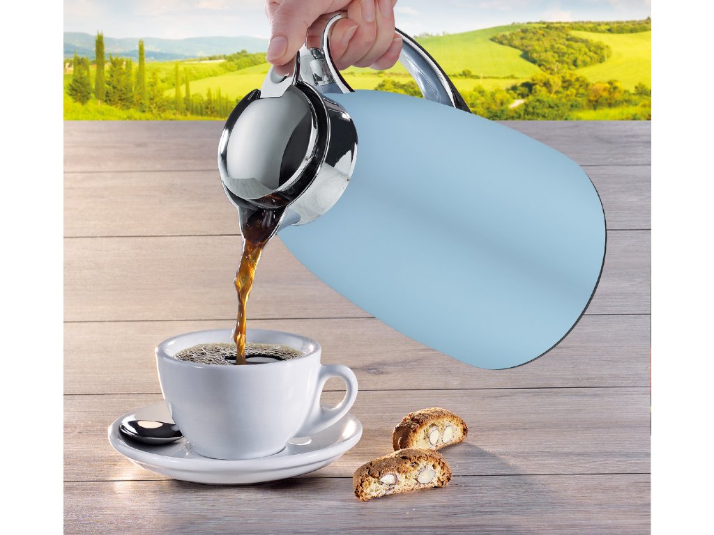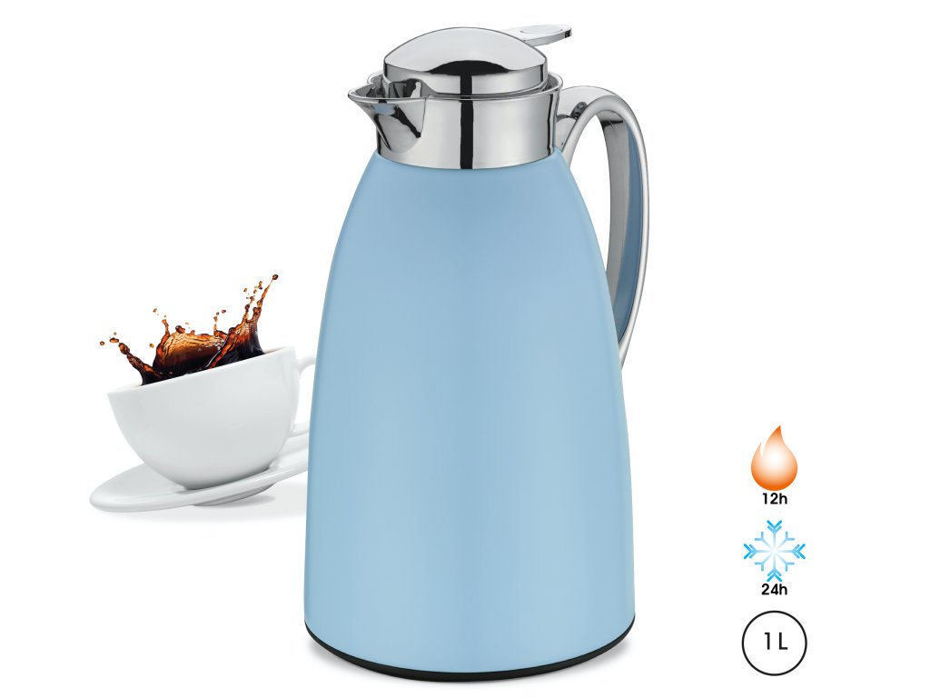 Díky termo konvici VENEZIA o objemu 1 l v nové světle modré barvě si můžete vychutnat svůj oblíbený nápoj při správné teplotě. Udrží kávu nebo čaj horký až 12 hodin, domácí limonáda na pikniky zůstane chladná až 24 hodin. Džbán se šroubovacím uzávěrem je vyrobený z matné nerezové oceli, uvnitř je tepelně odolná vložka z tvrzeného skla. Vakuová vložka z tvrzeného skla je robustní a tlačítko pro nalévání jednou rukou je ideální pro každého, komu vyhovuje multitasking. Vhodná i na cesty, když náhodou sklouzne na bok, nevylije se (testovali jsme to).
