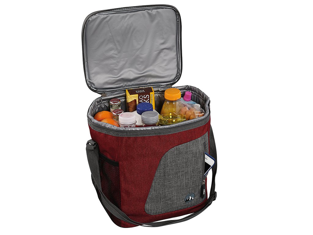 Červená termotaška CORTINA na uchovávání nebo přenášení potravin o objemu 13 l a rozměrech 27,5x20x25 cm, je vyrobená z polyesteru a pěnové folie. Izolační fólie uvnitř zajišťuje, že nápoje, ovoce, čokoládové tyčinky a sendviče zůstanou chladné a chutné několik hodin. Termotaška má nastavitelný popruh, můžete si zvolit, jakou chcete délku a disponuje jednou boční kapsou ze síťoviny a přední kapsou na zip.