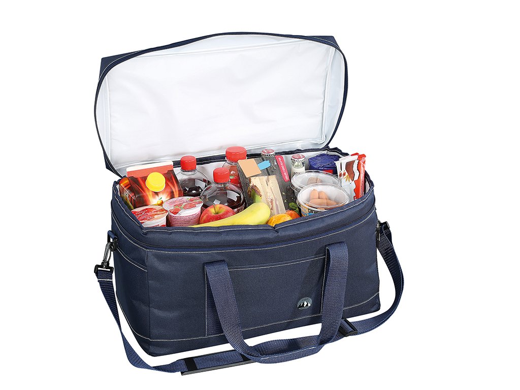 Modrá termotaška na uchovávání nebo přenášení potravin MARE o objemu 25 l a rozměrech 46x23x26 cm, je vyrobená z polyesteru a pěnové folie. Izolační fólie uvnitř zajišťuje, že nápoje, ovoce, čokoládové tyčinky a sendviče zůstanou chladné a chutné několik hodin. Termotaška má nastavitelný popruh, můžete si zvolit, jakou chcete délku a disponuje dvěma bočními kapsy a zipem.