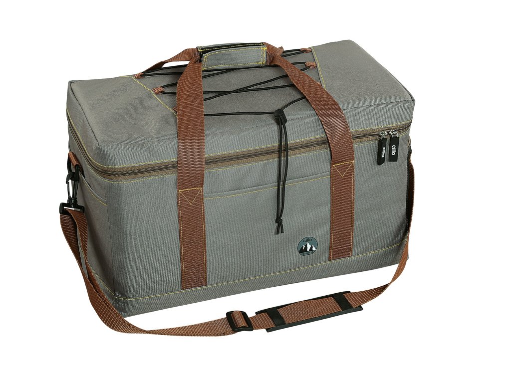 MARE Velká termotaška na uchovávání nebo přenášení potravin a nápojů o objemu 25 l a rozměrech 46x23x26 cm cm v šedé barvě s hnědými popruhy (taupe barva). Je vyrobená z odolného polyesteru a pěnové folie. Izolační fólie uvnitř zajišťuje, že nápoje, ovoce, čokoládové tyčinky a sendviče zůstanou chladné a dobré několik hodin. Termotaška má nastavitelný popruh, můžete si zvolit, jakou chcete délku a disponuje dvěma bočními kapsami a zipem. Díky vynikající tepelné izolaci termotašky vydrží potraviny čerstvé. Nezáleží na tom, zda jsou teplé nebo studené.
