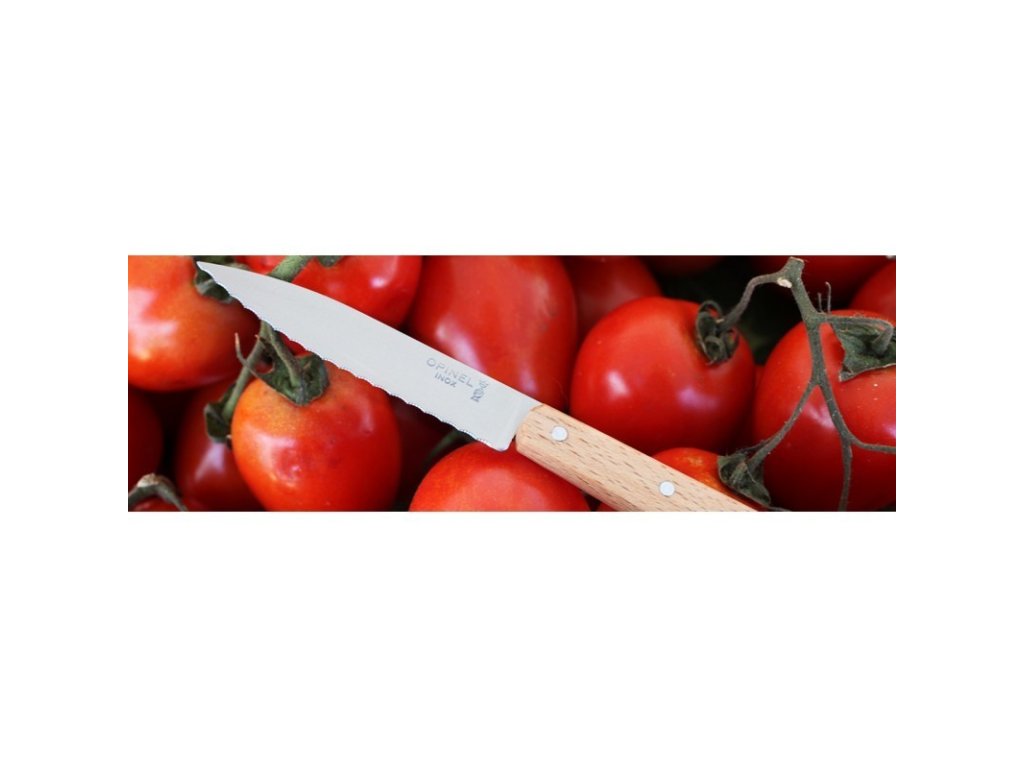Kvalitní francouzské nože Opinel, vyráběné tradičním způsobem v Chambéry v Savojských alpách, se vyznačují vynikající kvalitou řemeslného zpracování. Čepel je vyrobena z vysoce kvalitní švédské nerezové oceli Sandvik, která je vyhlášena pro svou odolnost a dlouhotrvající ostrost. Rukojeť je vyrobena z jednoho kusu bukového dřeva v přírodní barvě, je silně lakována pro zvýšenou odolnost. Čepel je k rukojeti připevněna pevnými nýty.