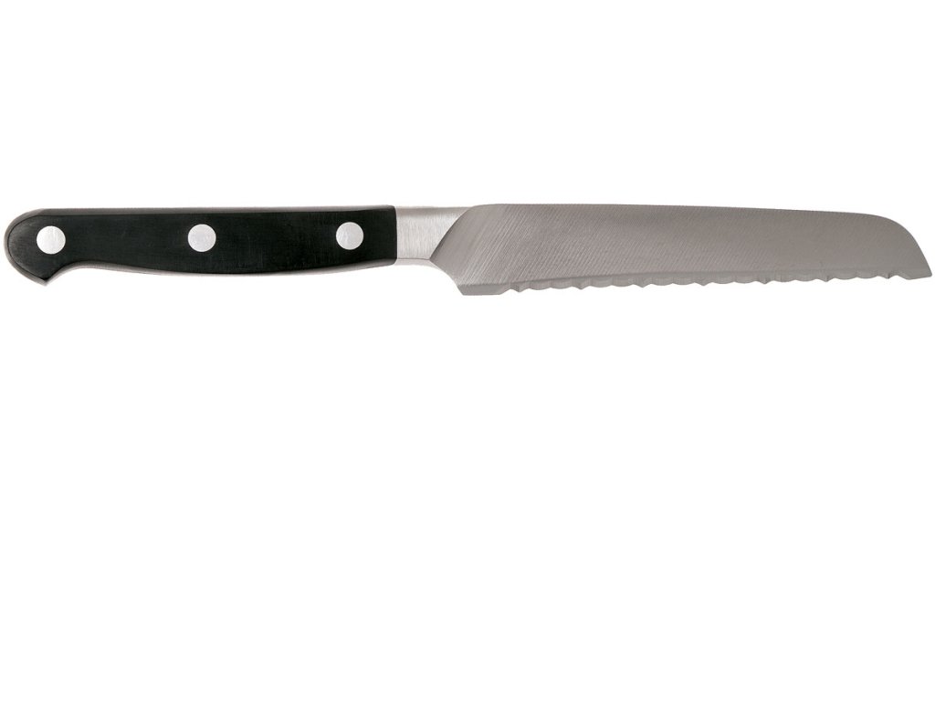 Univerzální vroubkovaný nůž z kolekce PRO s délkou čepele 13 cm od německé značky Zwilling J.A. Henckels. Univerzální nůž je ideální pro krájení měkkého ovoce a zeleniny nebo k rozřezávání různých druhů pečiva. Řada nožů PRO má nýtovanou rukojeť a ergonomicky tvarovanou díky níž je zacházení s noži bezpečné a pohodlné. Zesílená část nože mezi rukojetí a čepelí slouží k ochraně prstů a zároveň poskytuje oporu prstům.
