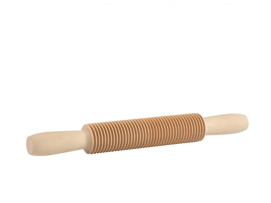 Dřevěný váleček na výrobu nudlí, špaget o šířce 3 mm, podávají se zejména s omáčkami nebo jen tak s rajčaty. Celková délka válečku je 31 cm a průměr 3,5 cm.