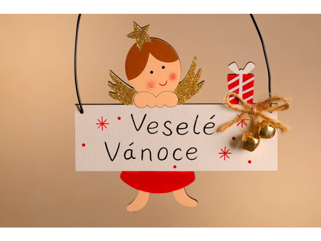 Originální a krásná vánoční ozdoba v podobě andílka opírající se o český nápis VESELÉ VÁNOCE využijete nejen jako vánoční ozdobu na váš vánoční stromeček, ale skvěle vynikne i jako závěs do vašeho okna. Můžete ji také použít jako doplněk k vašim krásně zabaleným vánočním dárečkům a přilepit ji na obal dárku nebo pomocí drátku přivázat. Z druhé strany nápisu můžete napsat své věnování, a tak bude obdarovaný vědět od koho dárek je, a zároveň si tuto ozdobu poté použije na svůj vánoční stromeček, který bude mít jako památku.