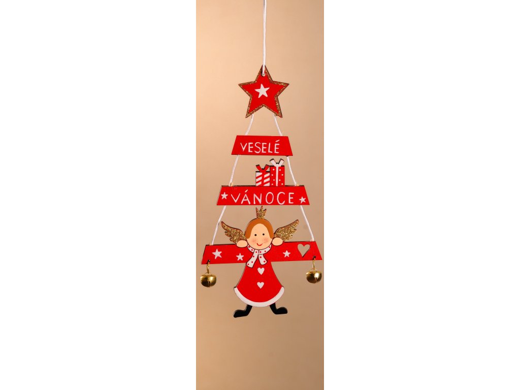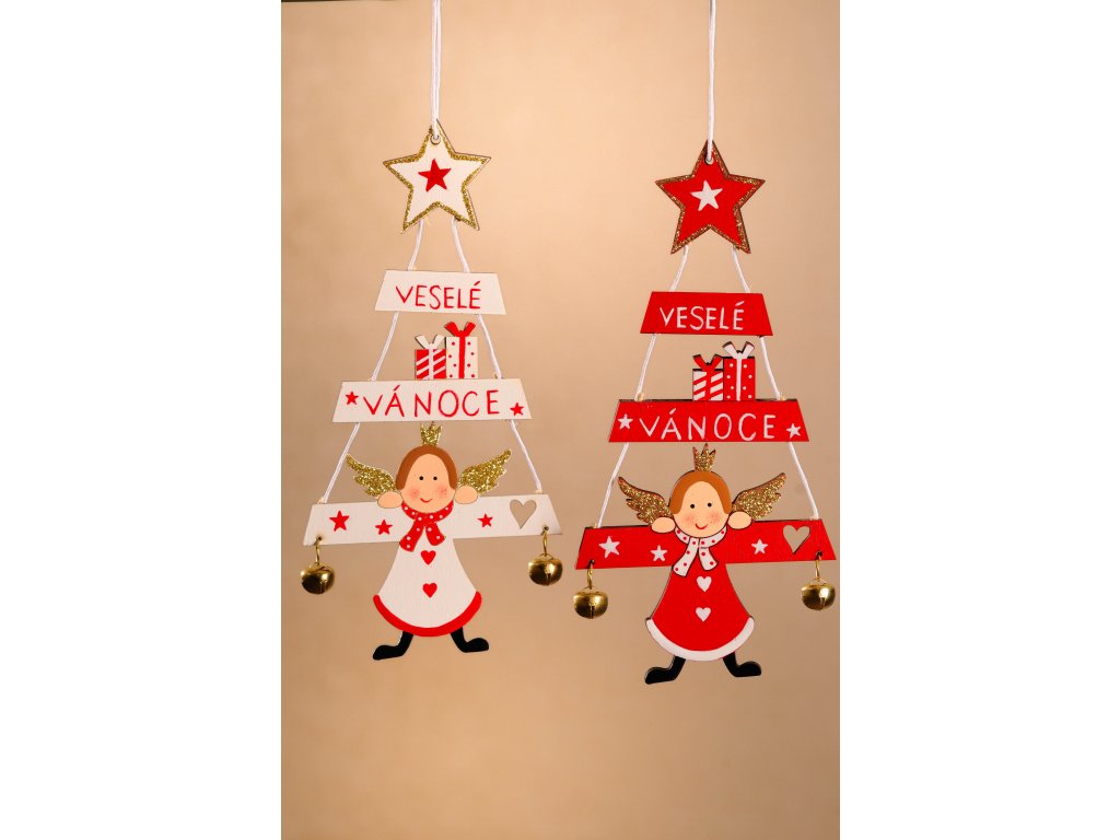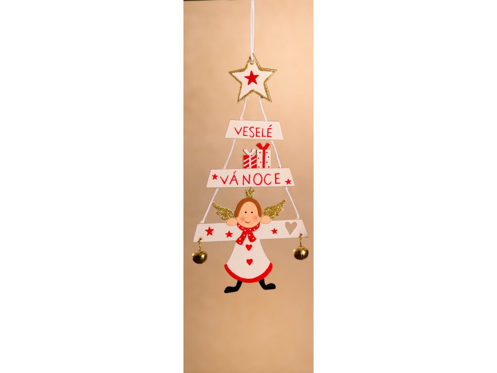Originální a krásná vánoční ozdoba v podobě stromečku s andílkem a českým nápisem VESELÉ VÁNOCE ozdobený rolničkami, zavěšená na bílém provázku. Můžete si zvolit barvu - bílou a nebo červenou. Využijete ji nejen jako vánoční ozdobu na váš vánoční stromeček, ale skvěle vynikne i jako závěs do vašeho okna. Můžete ji také použít jako doplněk k vašim krásně zabaleným vánočním dárečkům a přilepit ji na obal dárku nebo pomocí drátku přivázat. Z druhé strany nápisu můžete napsat své věnování, a tak bude obdarovaný vědět od koho dárek je, a zároveň si tuto ozdobu poté použije na svůj vánoční stromeček, který bude mít jako památku.