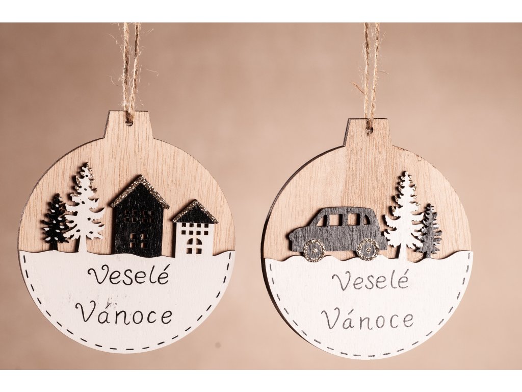 Originální a krásná vánoční ozdoba v podobě baňky s nápisem Veselé vánoce. V sadě jsou 2ks se dvěma různými motivy. Jsou výšky 10 cm, šířky 9 cm a tloušťky 0,5 cm. Využijete je nejen jako vánoční ozdobu na váš vánoční stromeček, ale skvěle vynikne jako doplněk na vánočním věnci nebo girlandě. Můžete ji také použít jako doplněk k vašim krásně zabaleným vánočním dárečkům a přilepit ji na obal dárku nebo pomocí provázku přivázat. Na zadní stranu můžete napsat věnování a baňky tak zůstanou na památku.