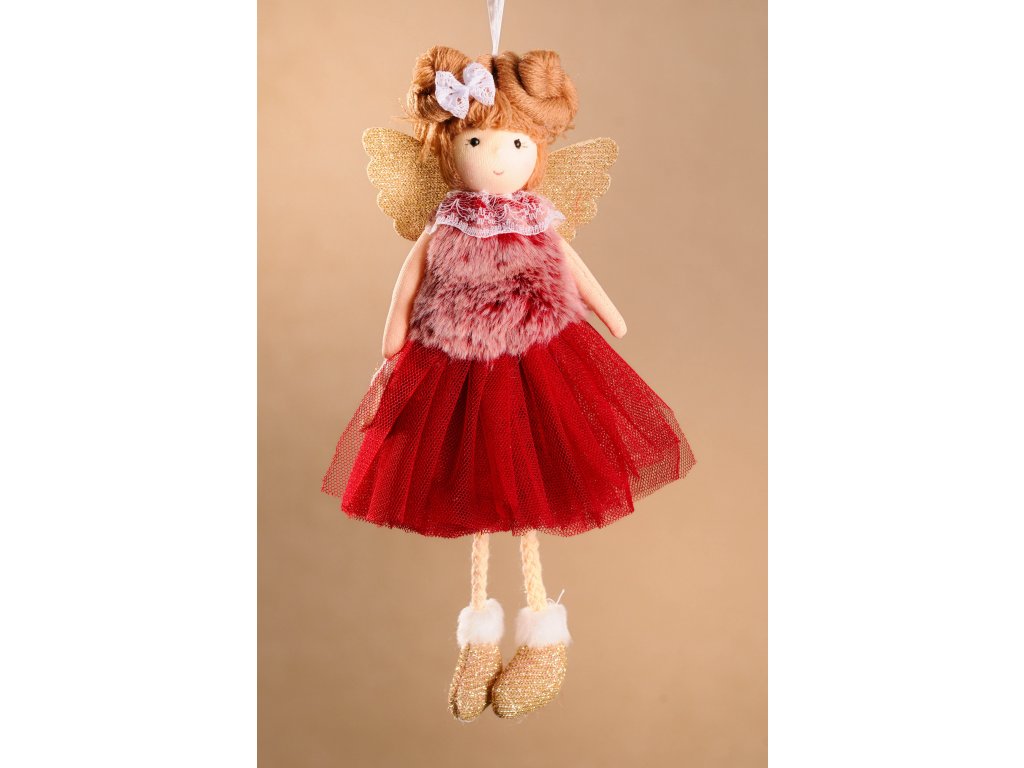 ANDÍLEK BETTY je krásnou vánoční ozdobou. Je vysoký 21 cm. Má krásnou a bohatou červenou tylovou sukni, z ní čouhají zlaté botečky lemované kožešinou, zlatá křidélka a v ruce drží zlaté srdíčko, ve kterém jsou vyraženy malé hvězdičky. Kolem krku má límeček z krajky a kožíšek je příjemně měkký. Vlasy jsou vyrobeny z vlny a ozdobeny mašličkou s korálkem ve tvaru srdíčka. Andílka můžete zavěsit, ale také připevnit na vánoční adventní věnec nebo zavěsit na záclonu.