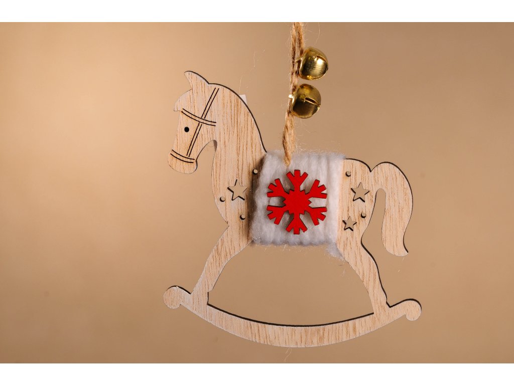 Originální a krásná vánoční ozdoba v podobě dřevěného koníčka s červenou vločkou a hvězdičkami, který je zavěšený na motouzovém provázku se dvěma rolničkami využijete nejen jako vánoční ozdobu na váš vánoční stromeček, ale skvěle vynikne i jako závěs do vašeho okna. Můžete ji také použít jako doplněk k vašim krásně zabaleným vánočním dárečkům a přilepit ji na obal dárku nebo pomocí provázku přivázat.