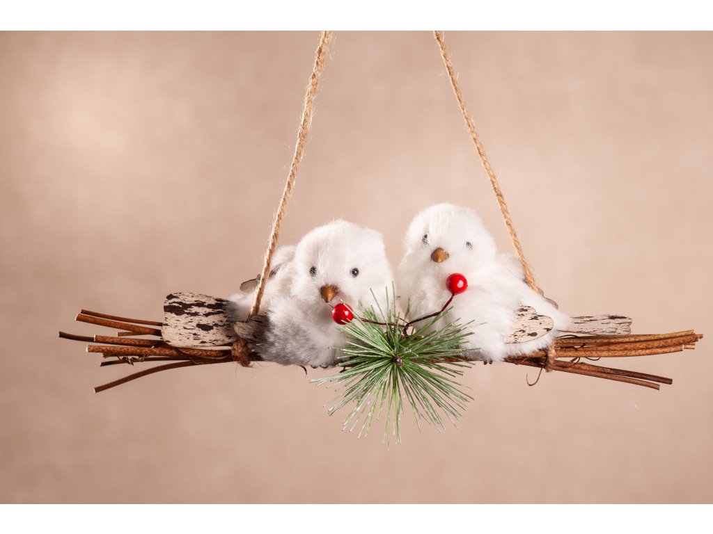 Dva bílí ptáčci sedí na proutěné větvičce. Větvička je ozdobena zeleno-bílým snítkem se šiškou a červenými bobulkami. Ptáčci jsou vysocí 7 cm a větvička je dlouhá cca 20 cm. Je to krásná zimní dekorace, kterou můžete zavěsit kamkoliv do prostoru a vynikne na dveřích i v oknech.