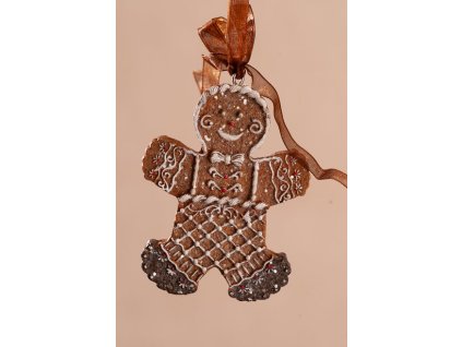 Má velmi pěkné, jemné, klasické zdobení a jeho povrch je opatřený decentními třpytkami. Také zavěšení je řešeno hnědou stužkou, která dokonale ladí s designem perníku.