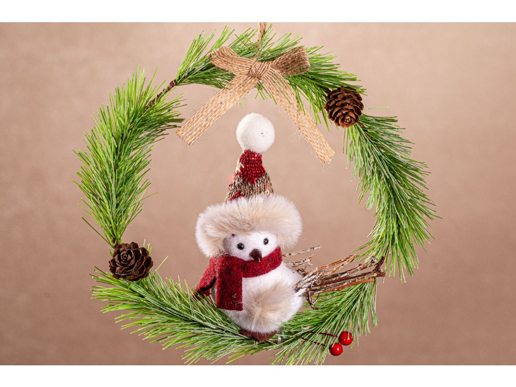 Zimní věnec na dveře, do okna nebo kamkoliv do prostoru. Jehličí je zeleno-bílé barvy. Ptáček je bílý a na hlavě má červený kulich lemovaný kožešinkou. Kolem krku má červenou šálu. Věneček je dozdoben malými šiškami a zavěsíte ho na provázek. Novinka z vánoční kolekce pro rok 2023. Letos je opět velmi krásná.