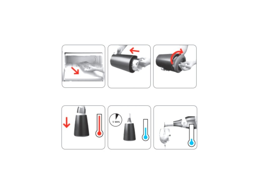 Rychle chladící nerezový obal na láhev vína. Skládá se z vnějšího černého pláště (krytu) a samotného obalu, který je vyplněn zdravotně nezávadným gelem, který je velmi skladný. Gel zůstává i při velmi nízkých teplotách kapalný, což znamená, že se plně přizpůsobí povrchu láhve. Vložíme láhev vína kterou chceme vychladit. Aktivně do 5 minut vychladí víno a udržuje jej chladné 2 hodiny.