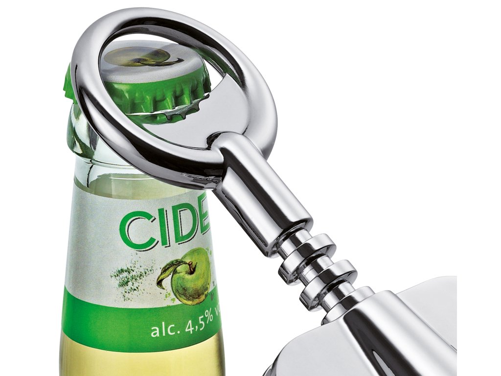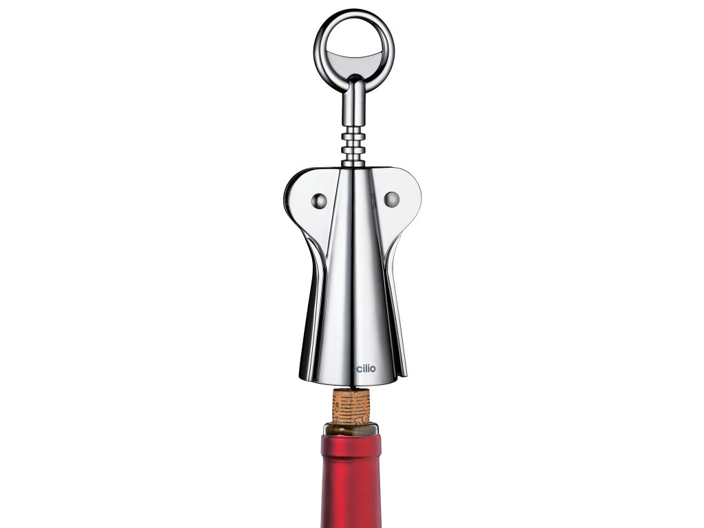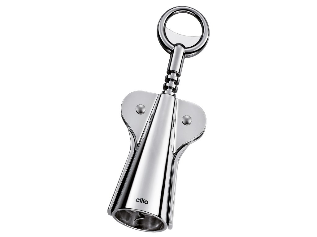 RISERVA Číšnický otvírák od špičkové německé značky Cilio má tři funkce. Slouží jako vývrtka, řezačka fólie a nůž. Chromové provedení.