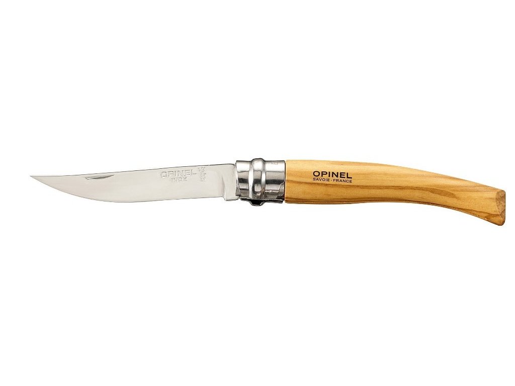 Nůž Opinel VRI N°08 Inox Slim s délkou čepele 8,5 cm a rukojetí z olivového dřeva je perfektní pro filetování ryb, krájení na tenké plátky a také jako zavírací jídelní nůž. Svou velikostí je ideální také jako kapesní nůž.