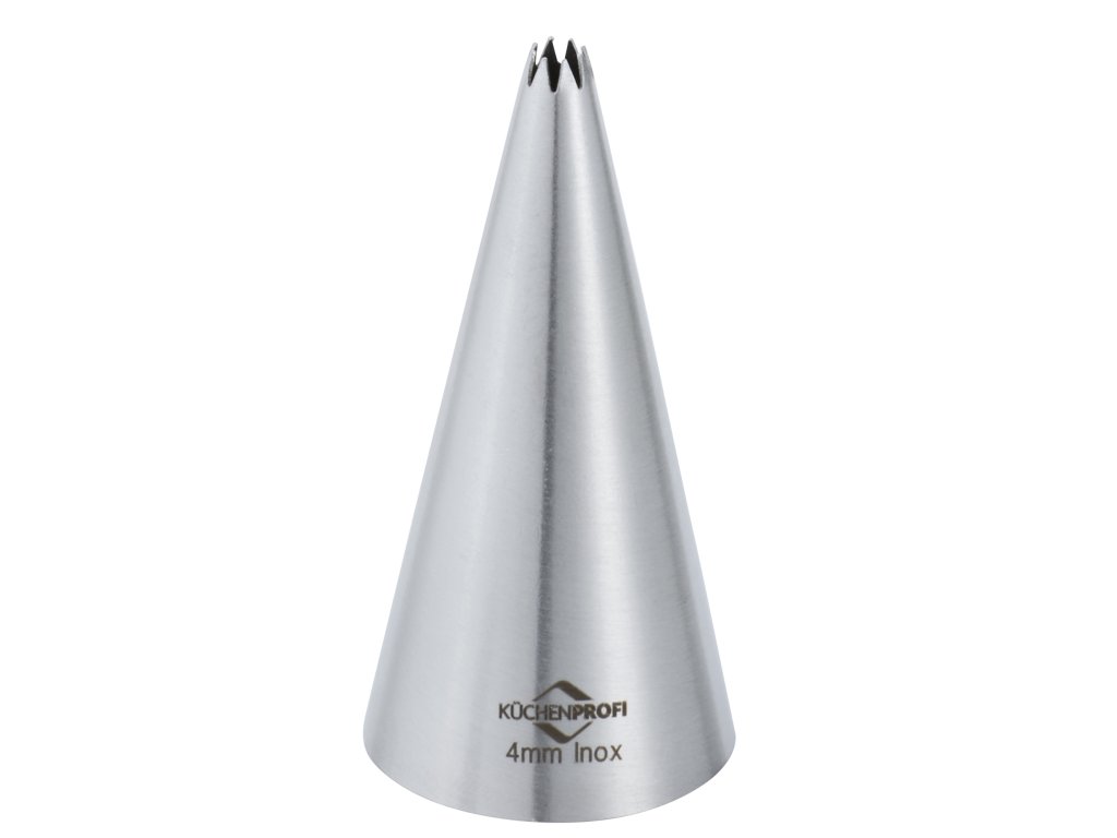 BAKE Profesionální zdobící hvězdicová špička na dorty, cukroví, muffiny, kanapky a studené mísy z řady cukrářských a pečících potřeb potřeb BAKE od německé značky Küchenprofi. Průměr otvoru 4 mm. Rozměry trysky: výška 5,5 cm, průměr 3 cm. Je vyrobena z nerezové oceli, která je odolná proti korozi.