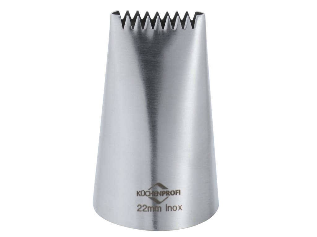BAKE Profesionální zdobící špička s oboustranným vroubkovaným otvorem pro dekorování dortů, cukroví, muffinů, kanapek a studených mís z řady cukrářských a pečících potřeb potřeb BAKE od německé značky Küchenprofi. Velikost otvoru 22 mm. Rozměry trysky: výška 4 cm, průměr 3 cm. Je vyrobena z nerezové oceli, která je odolná proti korozi.