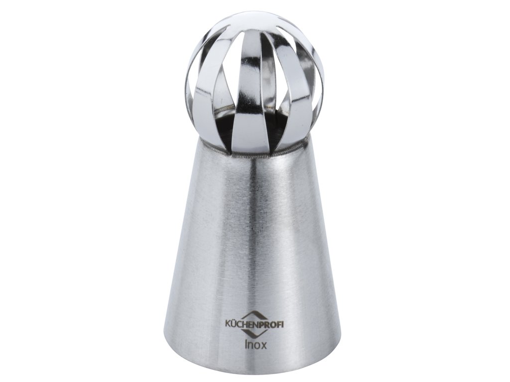 BAKE Profesionální zdobící špička na vytváření krásných obláčků pro dekorování dortů, cukroví, muffinů, kanapek a studených mís z řady cukrářských a pečících potřeb potřeb BAKE od německé značky Küchenprofi. Průměr otvoru 25 mm Rozměry trysky: výška 5,5 cm, průměr 3 cm. Je vyrobena z nerezové oceli, která je odolná proti korozi.