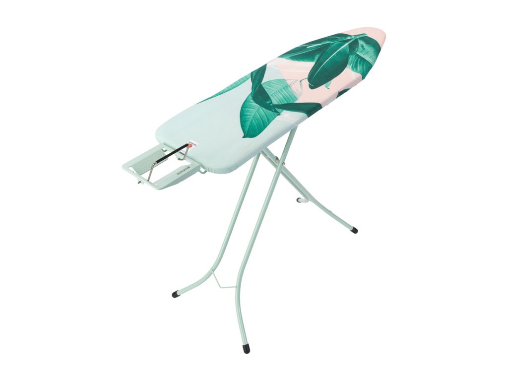 Prkno má dětskou pojistku proti nechtěnému složení. Protiskluzové ochranné kryty na nohách žehlícího prkna brání posunu po podlaze a současně ji chrání před poškrábáním. Prkno je výškově nastavitelné na 7 poloh - od 69 cm do 96 cm. Pracovní plocha má potah ze 100% bavlny s motivem TROPICAL LEAVES a na spodní straně má vrstvu elastické pěny.
